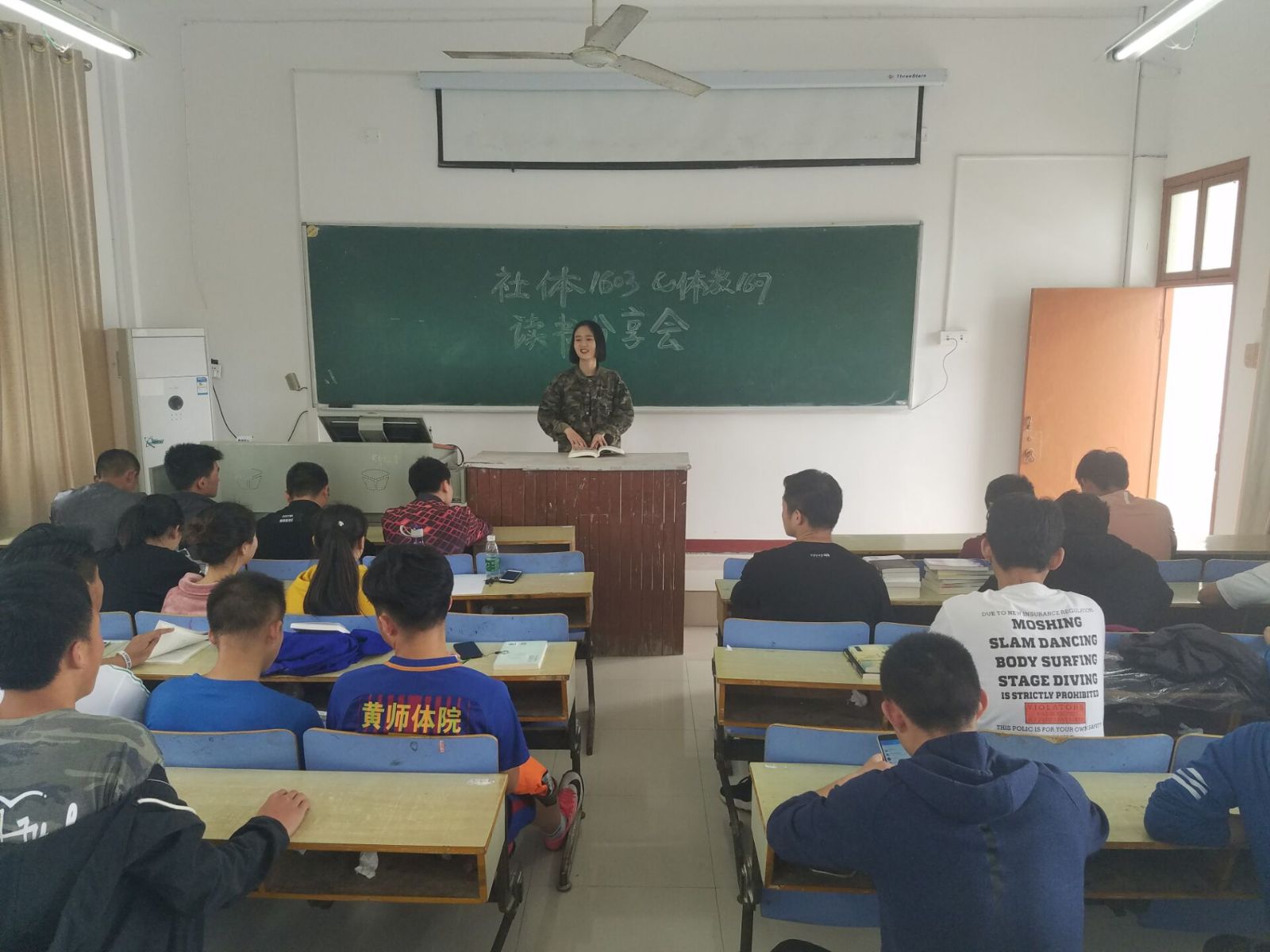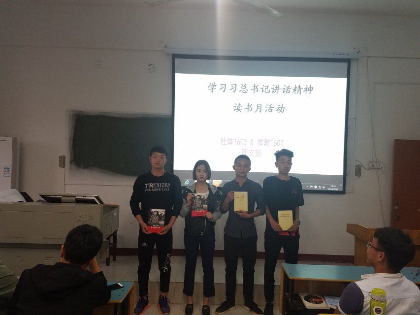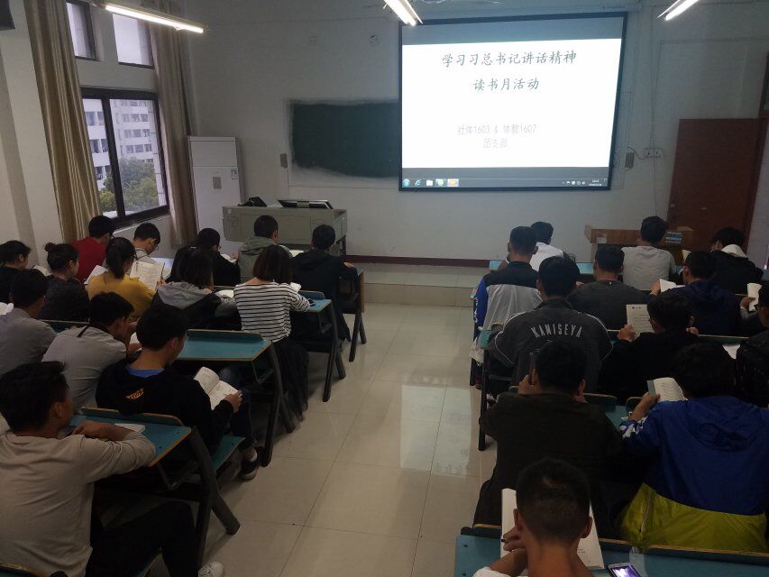 | 为积极响应校团委的号召,让同学们更加积极学习十九大报告精神及有更多的了解,引导同学们学习会议精神,在课堂里做一名好学生,在日常工作中做一名好干部,在社会实践方面做一名好青年,使同学们树立正确的世界观、人生观和价值观。中国新青年拥有着更好的学习环境,学习条件,更多的学习机会,拥有更多的权利去追求理想,展望未来,团员青年的知识结构与精神状况直接影响到当前的现代化建设。也为大学生的课余生活更加丰富多彩,学习十九大报告精神,不忘初心,砥砺前行。更能反映出当代大学生,当代新青年所存在的问题和不足,提醒同学们,不断反思,不停完善自身,在稳固基础的同时能有更多创新的理念,能够展现大学生积极向上的风貌,用正确的态度面对大学生活,为自己未来的发展储备知识。倡导广大学生青年积极学习会议精神,提高思想觉悟,做实在事当实在人。脚踏实地,实事求是,使当代大学生独有的青春活力与朝气勃勃的社会氛围相融合相适应! 社体1603及体教1607团支部带头在这个春意昂扬的春季举行了本次读书交流会。3月15日下午在力行楼501教室召开读书月启动仪式,首先由两位团支书给每位同学讲解这次团日活动的目的与意义,然后班主任董老师也做了总结性讲话,并给每人赠送一本阅读书籍,鼓励大家多读书,打造书香校园。4月20日晚上两个班共40名同学又重聚一堂,分享读书的感受与收获,大家纷纷表示,会抽时间、静下心多来读读好书,提高自己的文化修养。