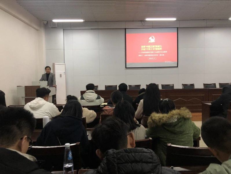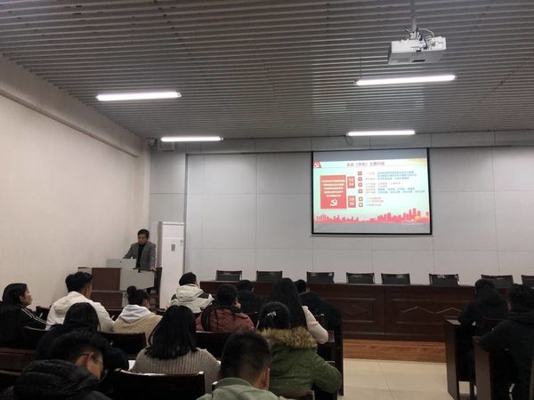 2019年12月11日晚七点,全讯新2网官网党总支书记黄文利在体育馆205会议室给全体学生党员及入党积极分子进行宣讲“十九届四中全会精神”。