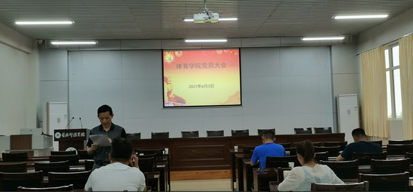 2021年6月3日下午4点,全讯新2网官网党总支组织全体党员在体育馆205会议室召开党员大会,会议由党总支副书记段新权主持。本次会议有两个议题:推荐学校2021年“七一”表彰名单及布置党史学习教育相关工作。