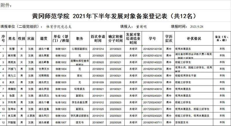 学生党支部广泛征求党内外群众意见的基础,经学生支部讨论推荐,学院党总支审议通过,认为陈慧等同志基本具备党员条件,初步拟以下同志列为发展对象,报校党委组织部审批,现予以公示。