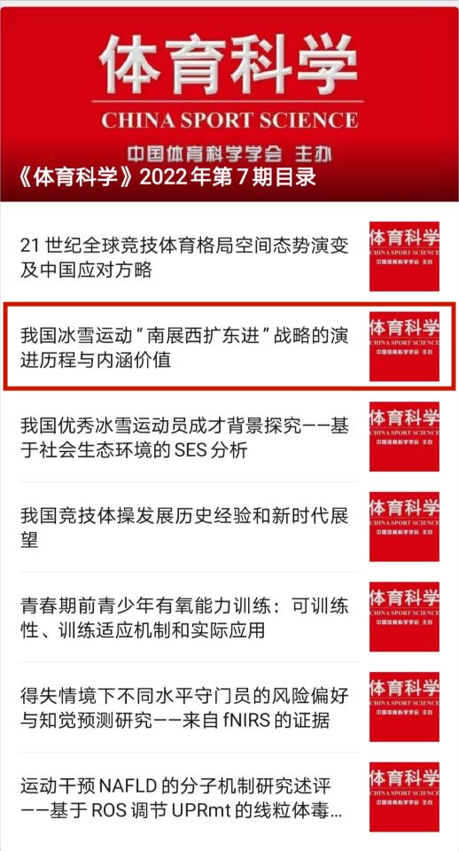 《体育科学》是由国家体育总局主管,中国体育科学学会主办的国内体育学顶级期刊,系中国体育科学学会会刊、AMI综合评价(A刊)权威期刊、中国期刊方阵双高期刊、CSSCI来源期刊、国家社科基金资助期刊、国家科协资助期刊、全国中文核心期刊。该刊主要刊发体育各学科领域基础研究和应用研究方面具有原创性和重要指导意义的高水平最新研究成果。《我国冰雪运动“南展西扩东进”战略的演进历程与内涵价值》一文,探讨了北京冬奥背景下我国冰雪运动“南展西扩东进”战略的演变历程与特征,从内涵和地理区划的角度厘定了“南展西扩东进”的地方区位,明确了该战略之于“三亿人参与冰雪运动”、北京冬奥、冰雪运动强国建设、世界冰雪运动发展乃至后冬奥时代冰雪运动发展的价值意义,对我国“十四五”时期冰雪运动项目发展乃至体育强国建设推进具有重大参考意义。