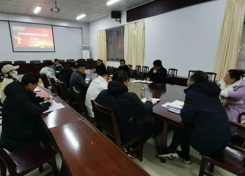 学院党委副书记韩阳首先重点强调了开学初班主任应及时召开安全主题班会,下宿舍核实学生到校情况并了解学生寒假期间的思想动态等,确保每个学生的安全与稳定。关注异常消费学生、尤其是家庭困难的学生动向,有挂科的同学班主任应重点关注并谈心,督促其认真复习准备学期初的考试及补考毕业生班级应重点关心学生就业、升学去向,尤其近期处于考研复试成绩公布、复试关键期,各位班主任应关心支持并给于他们相关的专业辅导,提高复试通过率,保证升学率。另外还通知了武装部关于2023年征兵工作的相关要求,需班主任广泛科学宣传,确保年龄与身体素质符合并有意愿入伍的同学能及时在网上报名。