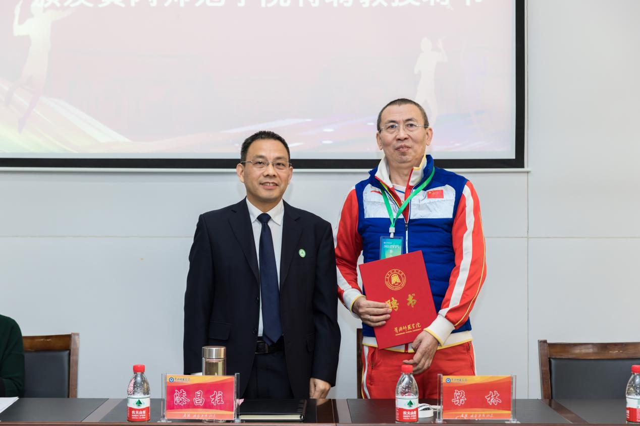 漆昌柱校长为梁林颁发全讯新2网官网特聘教授和全讯新2网官网体育文化研究中心名誉主任聘书