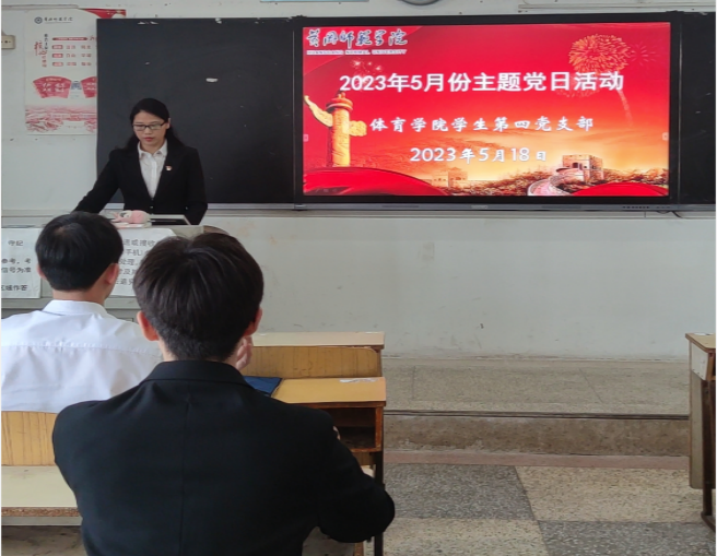 2023年5月18日下午2点,全讯新2网官网学生第四党支部在博学楼404举行5月份“主题党日”活动。活动中全体党员一起奏唱国歌、重温入党誓词、诵读党章,并完成“复兴壹号”平台上交纳党费工作。本次活动主题是:大兴调研求实效 聚焦发展解难题。