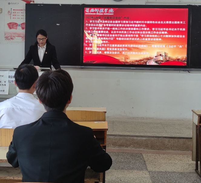 学生第四党支部书记董菊明传达学习习近平总书记在全国学习贯彻习近平新时代中国特色社会主义思想主题教育工作会议以及在广东考察时的重要讲话精神重要内容;学习党中央关于统一战线工作的决策部署和工作要求,学习习近平总书记关于民族宗教工作的重要论述,以及中央民族工作会议和全国宗教工作会议精神;学习王蒙徽书记在全省市厅级主要领导干部“学习贯彻党的二十大精神加快建设全国构建新发展格局先行区”专题培训班开班式的上的重要讲话精神;学习《习近平关于注重家庭家教家风建设论述摘编》,学习民法典、增强法治意识,要广泛开展民法典宣传。并组织支部全体到会党员观看短视频《习近平“典”亮新时代|家风篇》等党员教育宣传片。