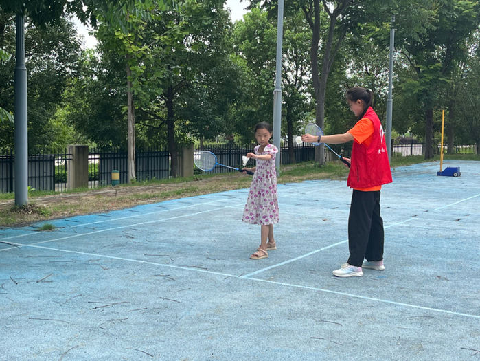 在白鹤林村党支部楼前,志愿者们正在给四年级学生上室外羽毛球课。校领导驻足现场观摩,并为学生志愿者们的耐心讲解、认真示范的精神点赞。