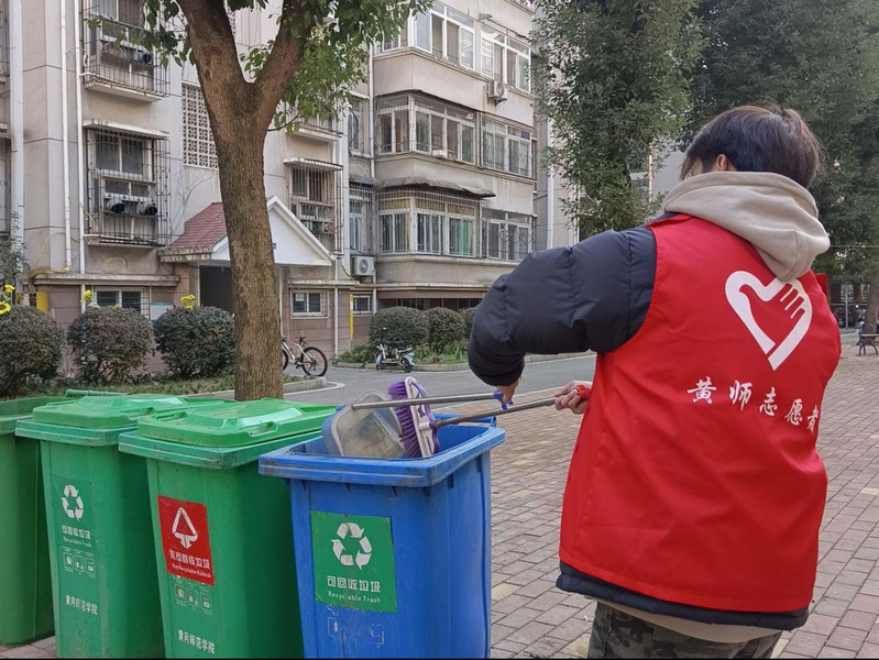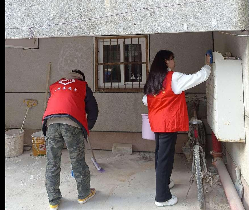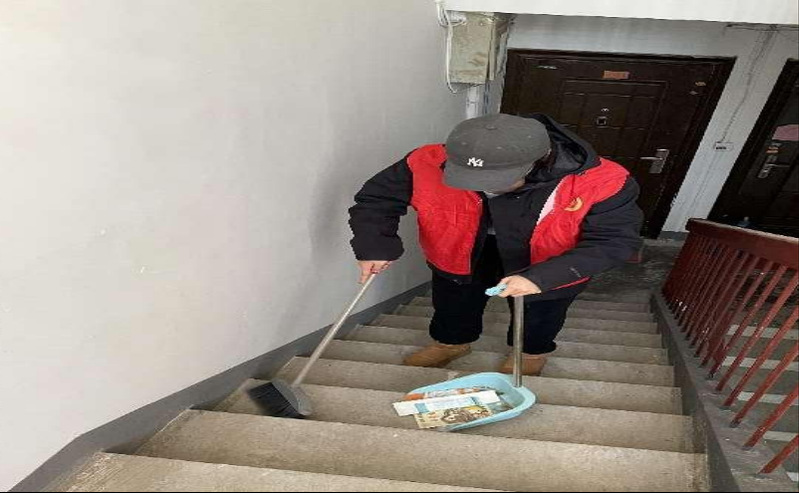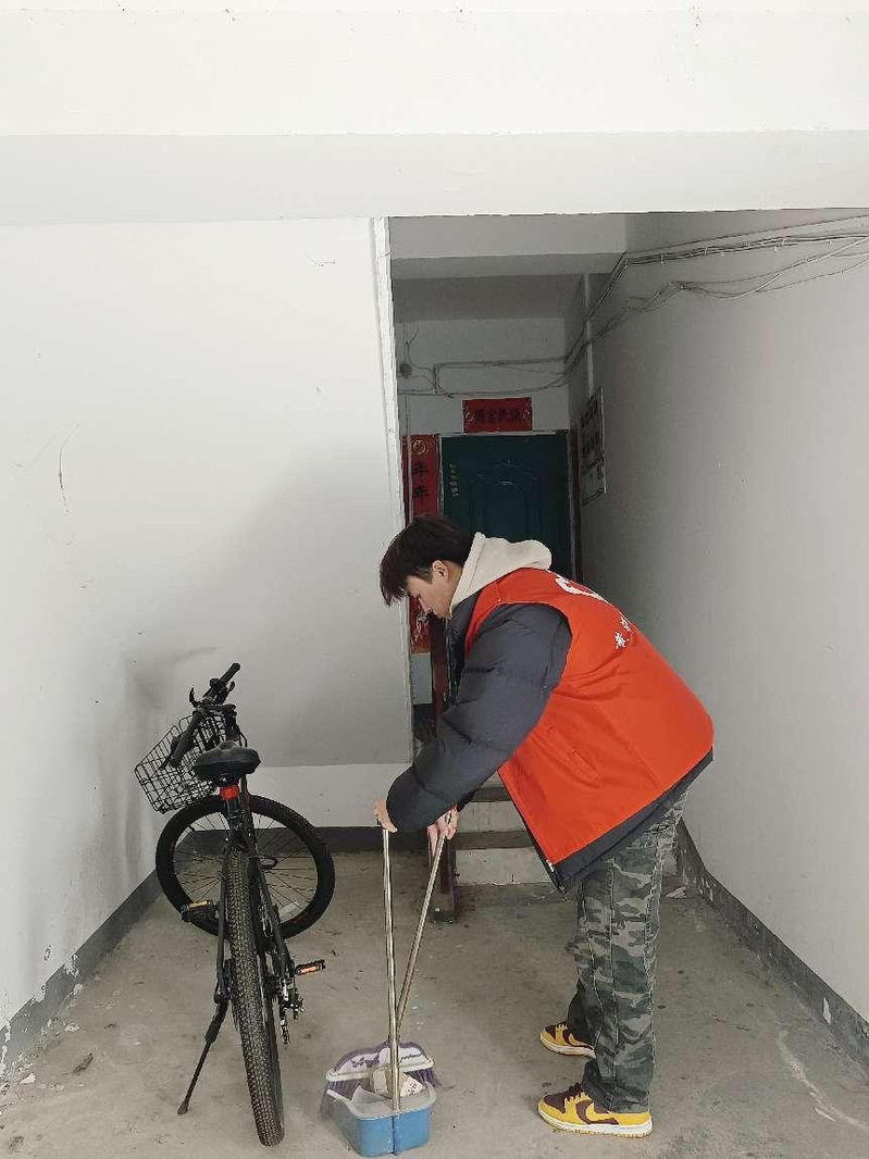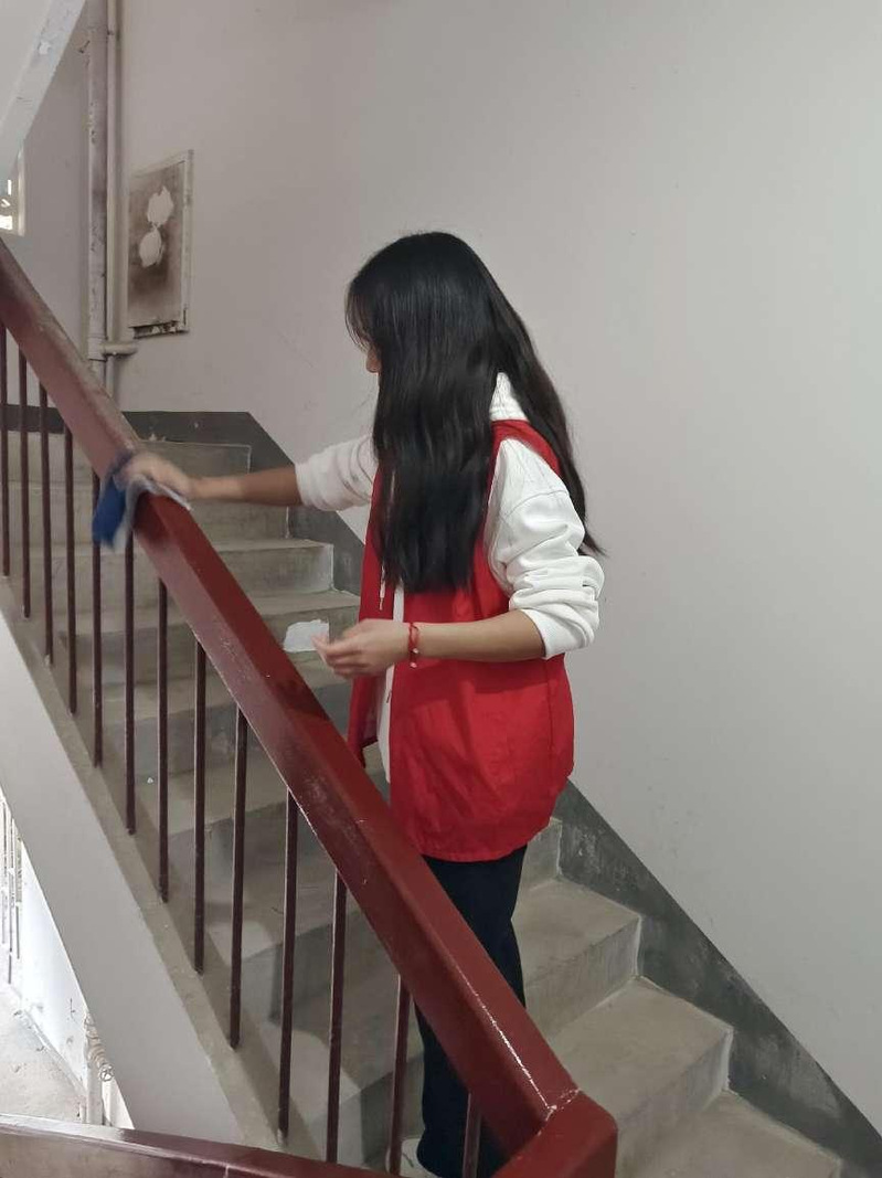 到达教职工生活区后,在学校退休老师肖全福、蒋长风等同志的带领下,对各楼栋进行打扫楼道、擦拭楼梯扶手等。