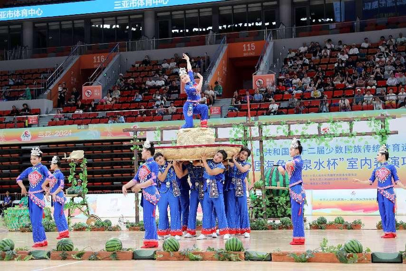 11月25日,在三亚体育中心,全讯表演项目技巧类《顶瓜瓜》队伍,代表湖北省正式亮相本次运动会表演项目赛场。随着音乐的响起,运动场化身翠绿的丰收瓜田,小伙子们在炎炎夏日,用草帽在休息之余表演精湛技巧,使观众眼前一亮,又逗乐不已,姑娘们则利用双手和双脚上下翻腾,将摘下的西瓜越堆越高,配合默契,更是赢得满堂喝彩。