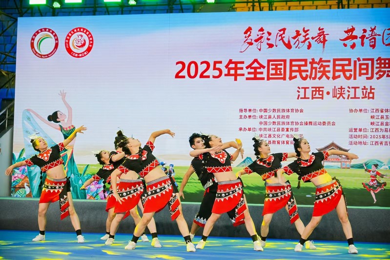 健美操队身着绚丽民族服饰,动作精准,展现出完美的团队协作和精湛舞技。