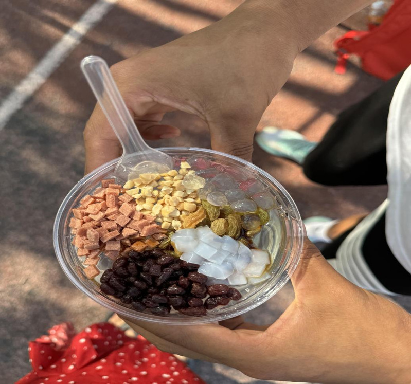 “跑累了,消耗了不少体力,来吃点冰粉!”过了一会儿,调皮的郭褀睿跑到冰粉制作区,林老师赶紧拿起同学们制作的冰粉,给他加上红糖、红豆、花生碎等配料,小郭同学毫不客气拿起坐着吃起来......
