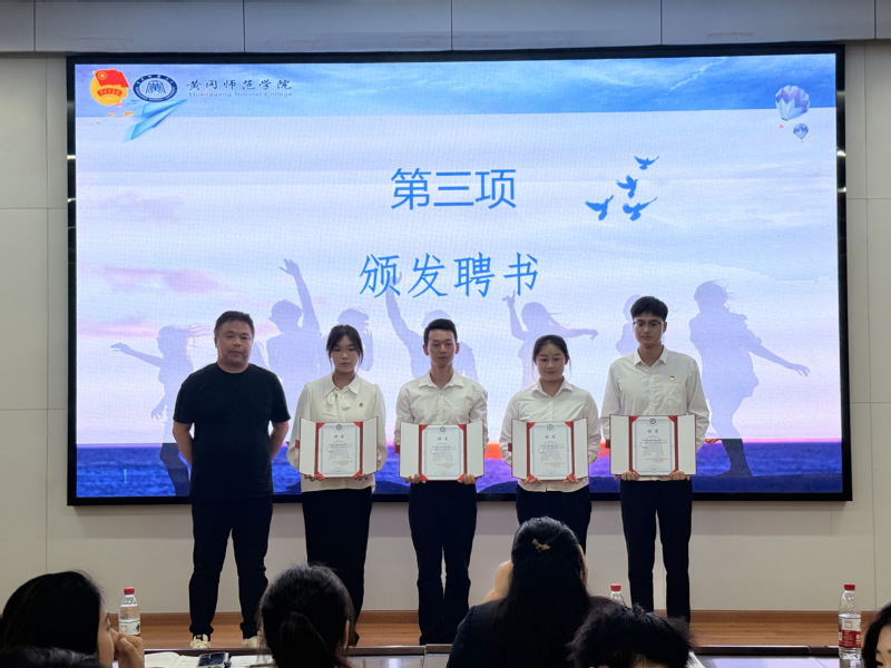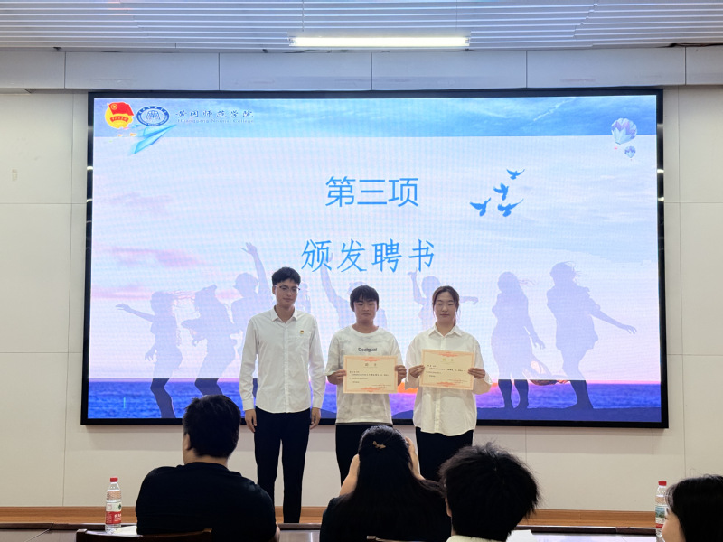 19时20分,换届进入最受关注的环节:聘书颁发与竞选演讲。上一届干事们逐一上台,从部长手中接过聘书,部长们从分管的主席团、副书记手中接过聘书,主席团和团委副书记则从韩阳副书记手中接过烫金聘书。这不仅是一份荣誉,更是'传承者'的勋章。拿到聘书的文艺部部长邓莉难掩激动,希望新一届能带着我们的经验,走得更稳、更远。