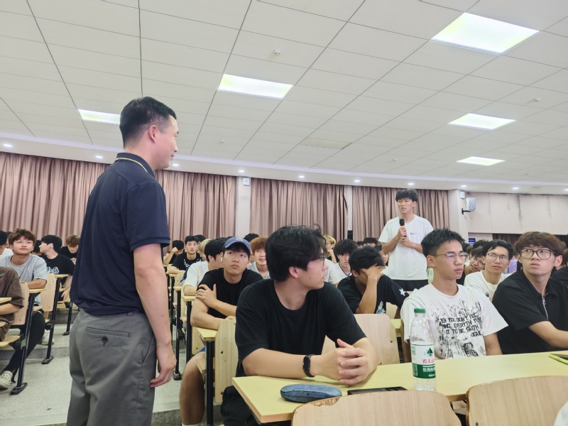 在提问环节,新生围绕“如何平衡训练与学习”等问题踊跃提问,胡教授用幽默与真诚的回答赢得全场掌声。